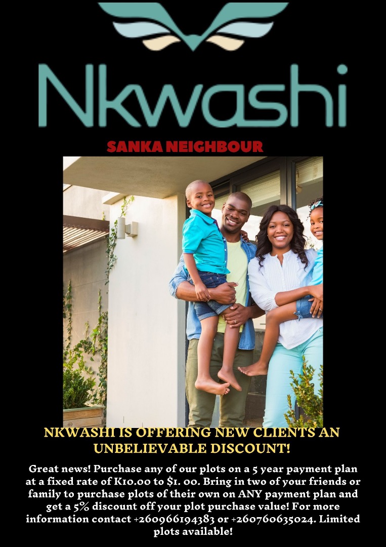 Great news! Purchase any of our plots on a 5 year payment plan, at a fixed rate of K 10.00 to 1.00. Bring in two of your friends or family to purchase plots of their own on ANY payment plan and get a discount on your plot purchase value! For more information contact 0966194383 or 0760635024. Limited plots available.